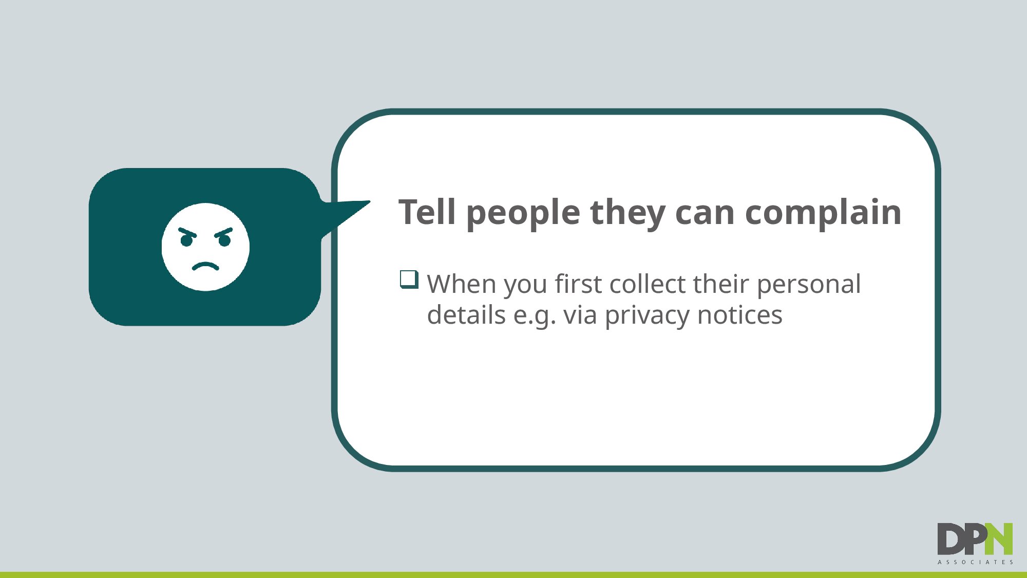 At the point you collect personal information, people must be told they can raise a data protection complaint. This means privacy notices will need to be updated. It also means when responding to Data Subject Access Requests, you’ll have to make sure you explain your complaints process.