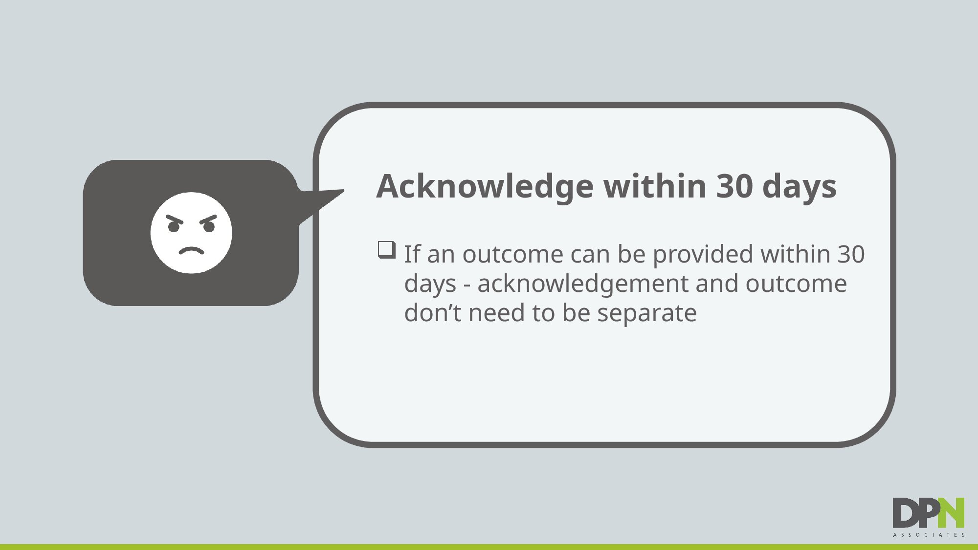 An outcome must be provided without an unjustifiable or excessive delay. If it’s possible to do this within 30 days of receiving the complaint, it’s not necessary to provide an acknowledgement and outcome separately.
