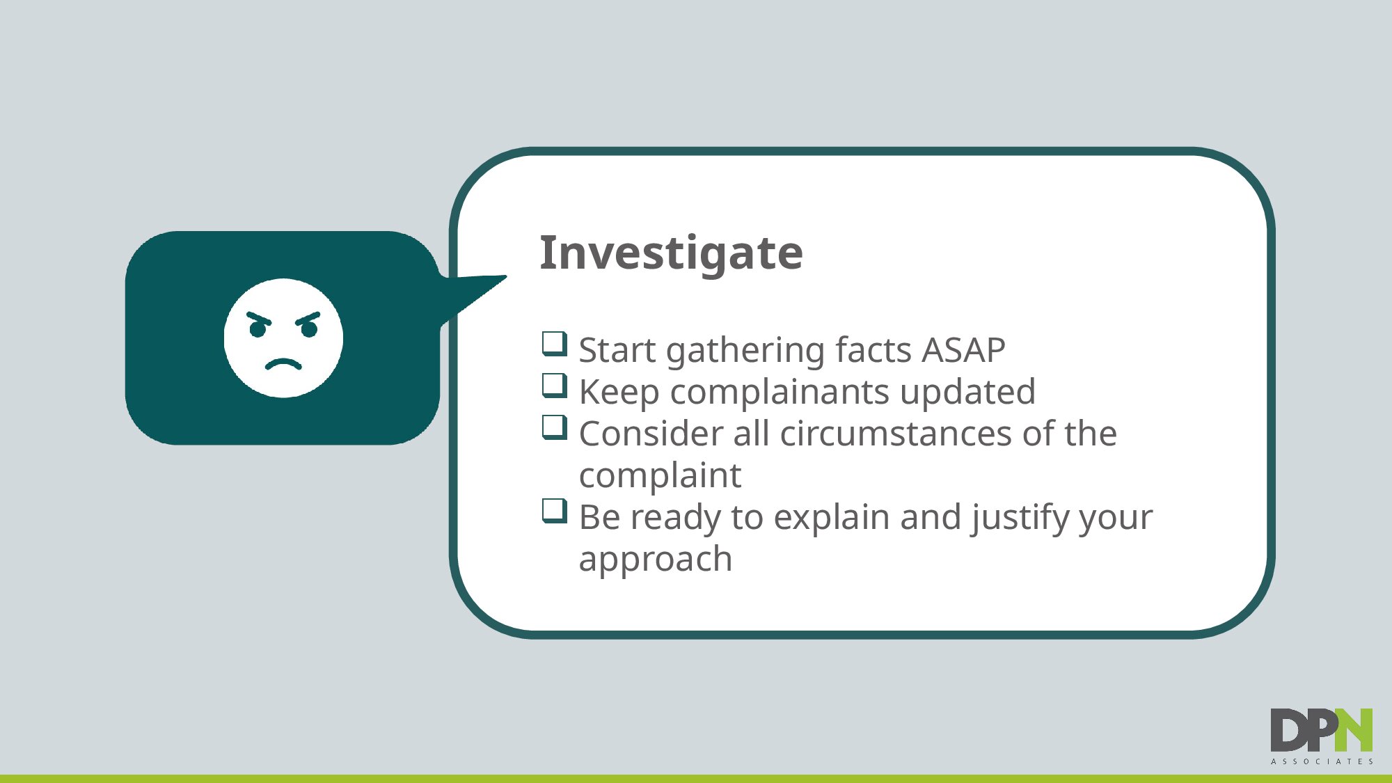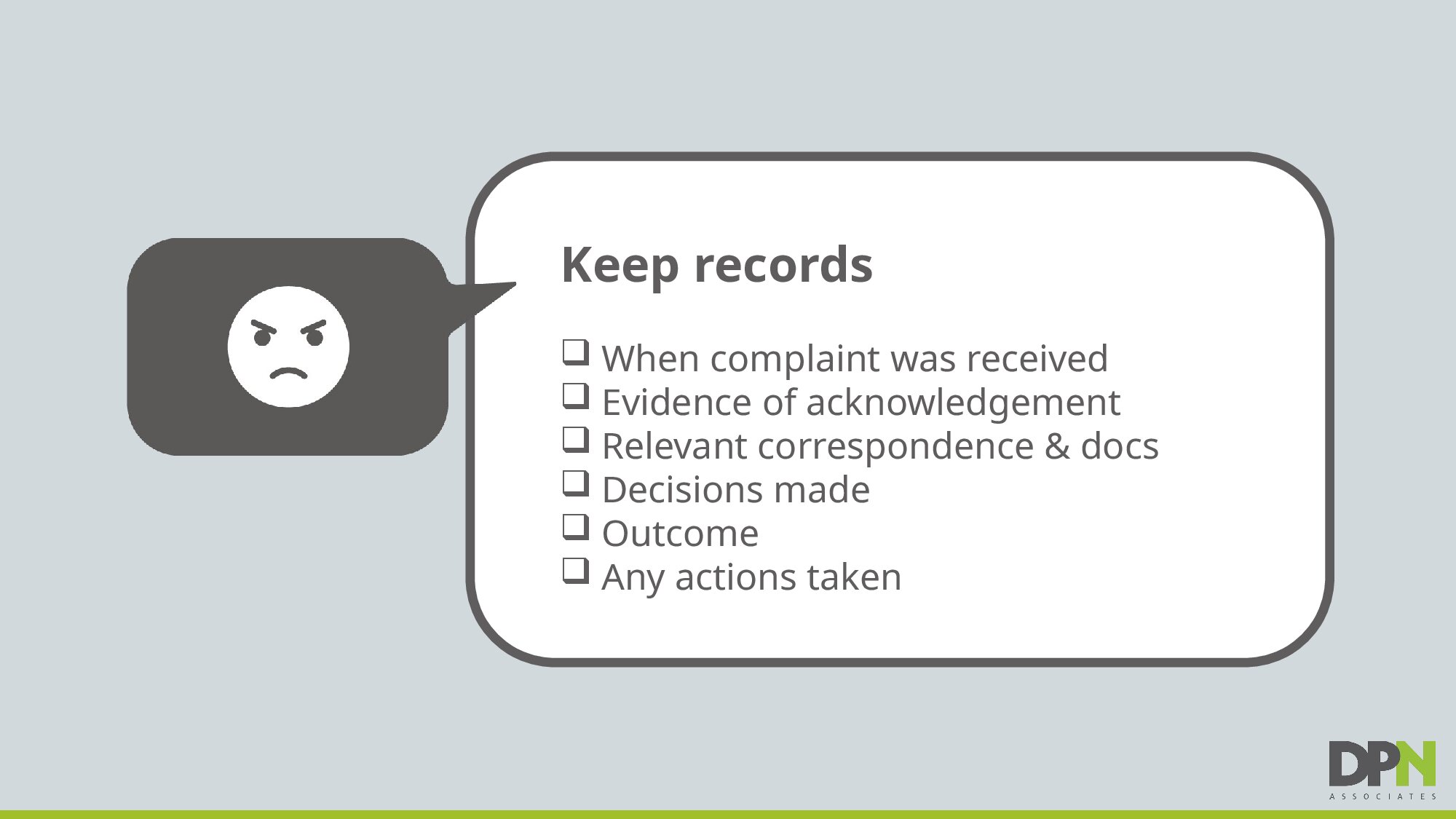 Complainants should be kept informed about your progress. This could include providing an expected date for the outcome, a point of contact for questions and explanation of any delays.