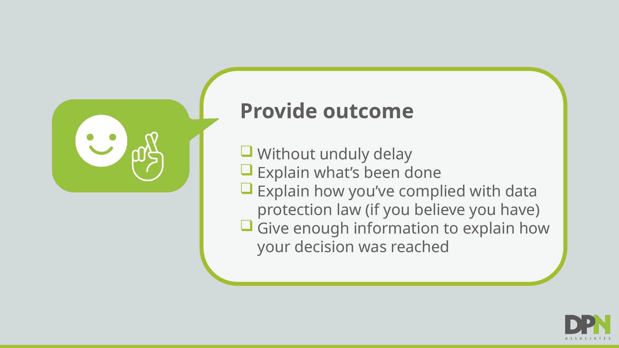 There are no set rules on how you communicate the outcome with the complainant. For example, relatively straightforward complaints can be resolved over the telephone. However, the ICO would expect the outcome to include:
