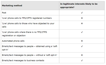 It’s worth noting the PECR rules on consent and the soft opt-in don’t apply to corporate subscribers – in other words people’s work email addresses (as long as they are not sole traders). The ICO has published the following useful table setting out when legitimate interest may be an appropriate lawful basis for different direct marketing methods: