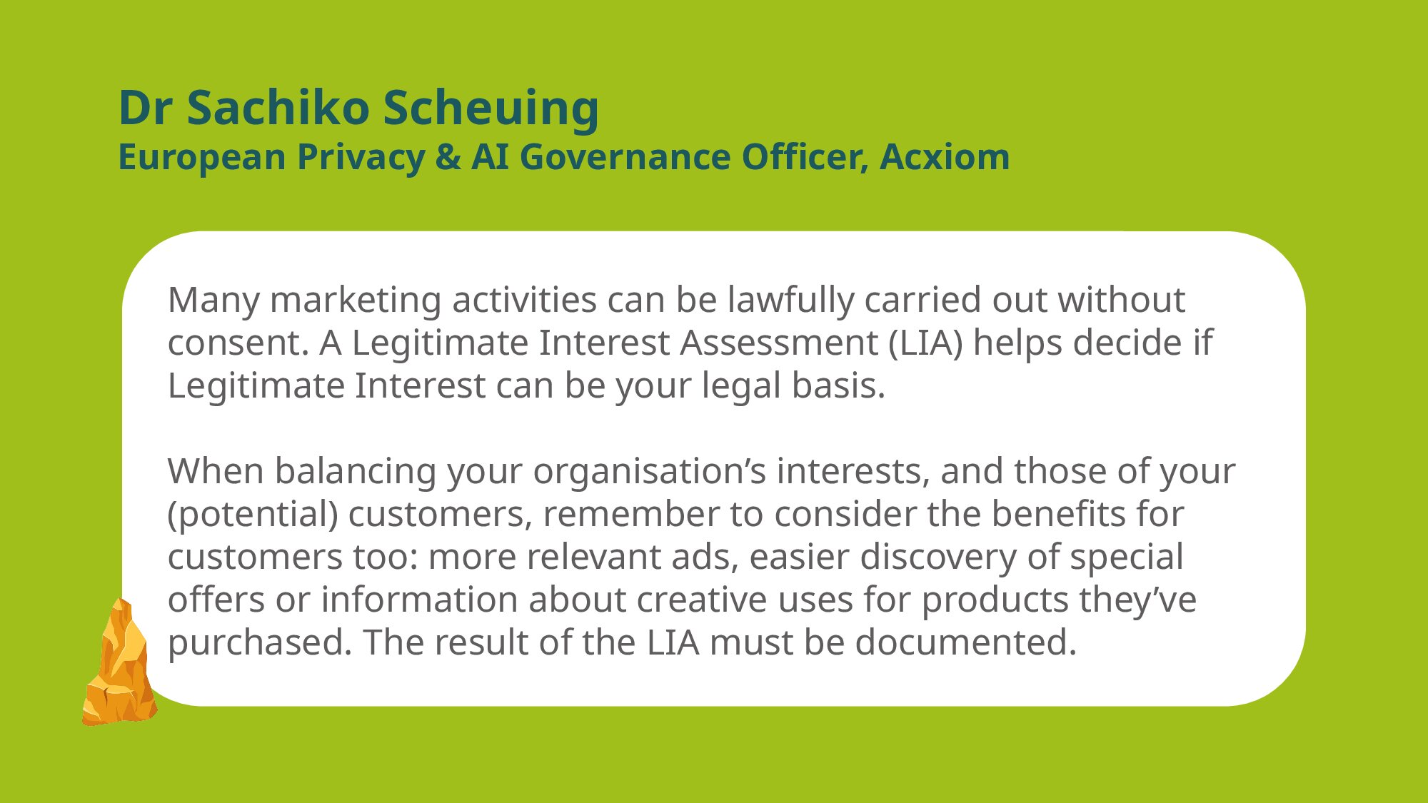 And to be clear, there’s no obligation to switch your lawful basis. If you’re currently rely on legitimate interests, have balanced this and are comfortable with it, you can keep things just as they are.
