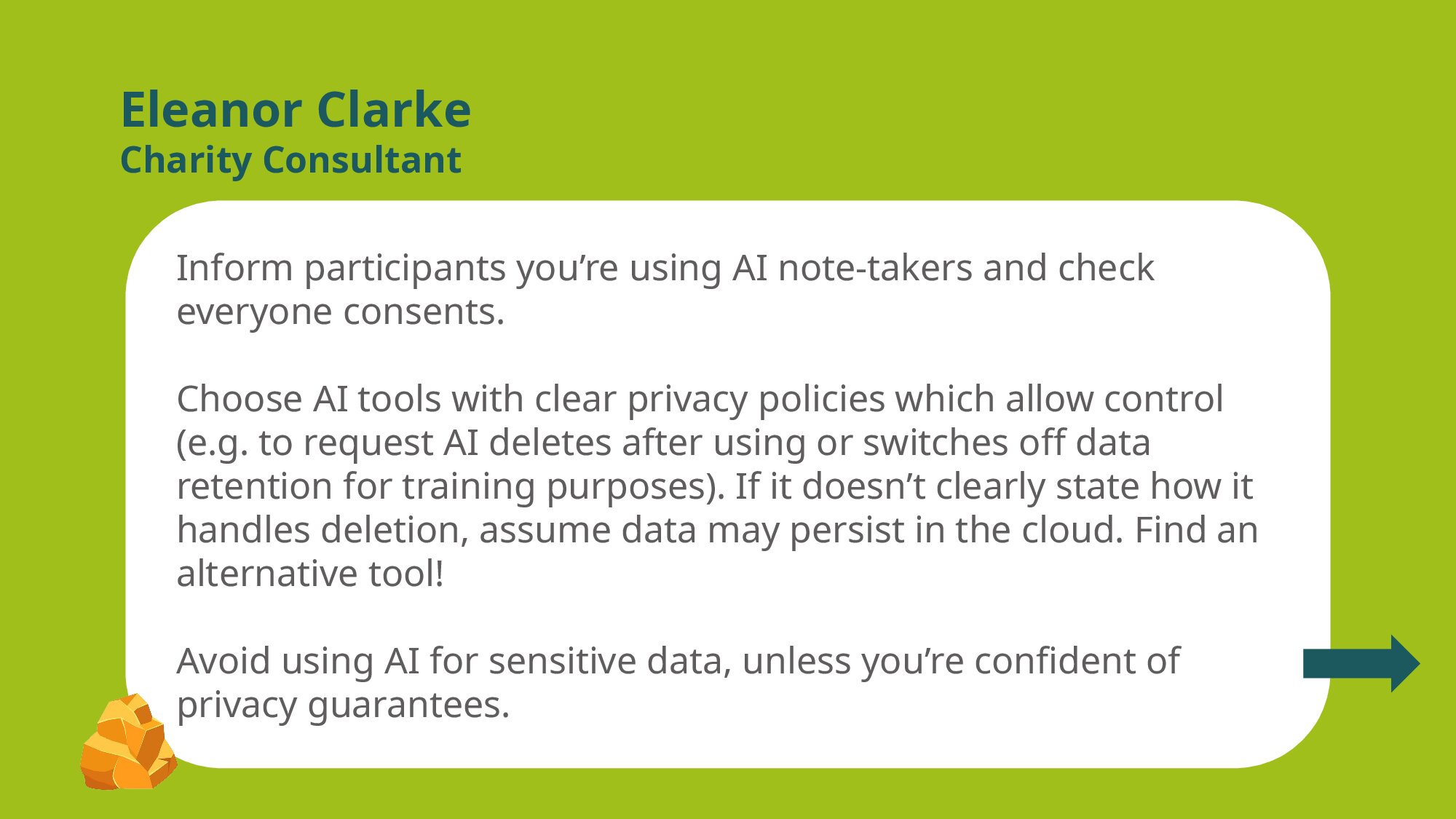 2. Internal policy / guidelines for usage: Set guidelines on when and how recording and transcription services should and should not be used. Include expected standards such as telling people in advance, giving them an opportunity to object, rules on sharing, deletion etc